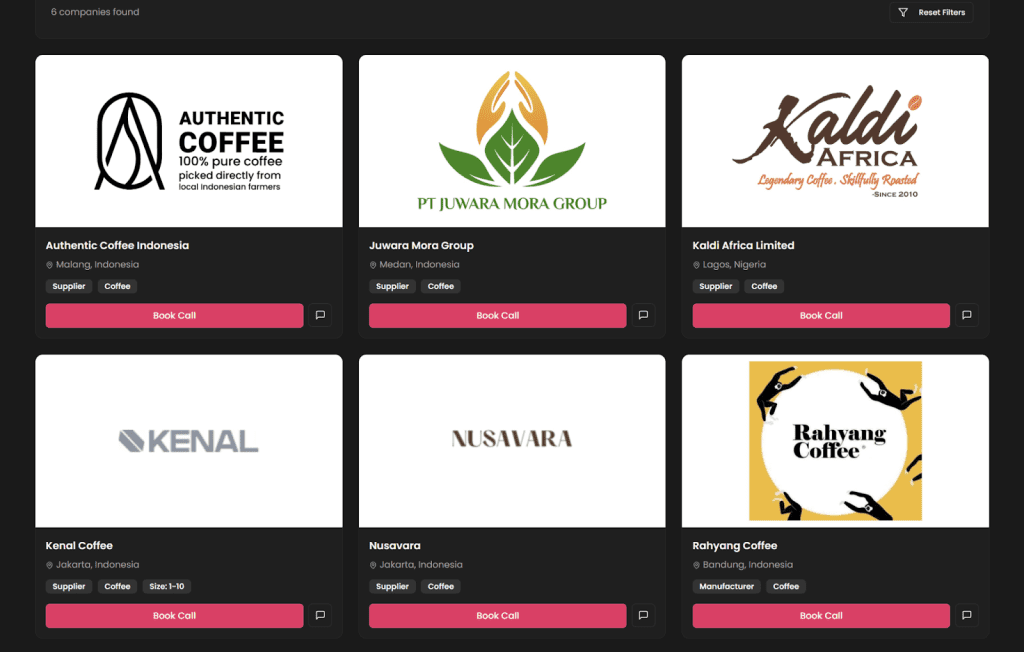 Hi Biz memberikan akses yang mudah dan terpercaya untuk menjalin kemitraan dengan perusahaan-perusahaan kopi terbaik di dunia. Semua perusahaan yang terdaftar telah terverifikasi dan memiliki rekam jejak yang solid dalam menyediakan produk berkualitas. Jika Anda tertarik untuk memperluas bisnis kopi Anda, Hi Biz adalah platform yang tepat untuk Anda jelajahi.